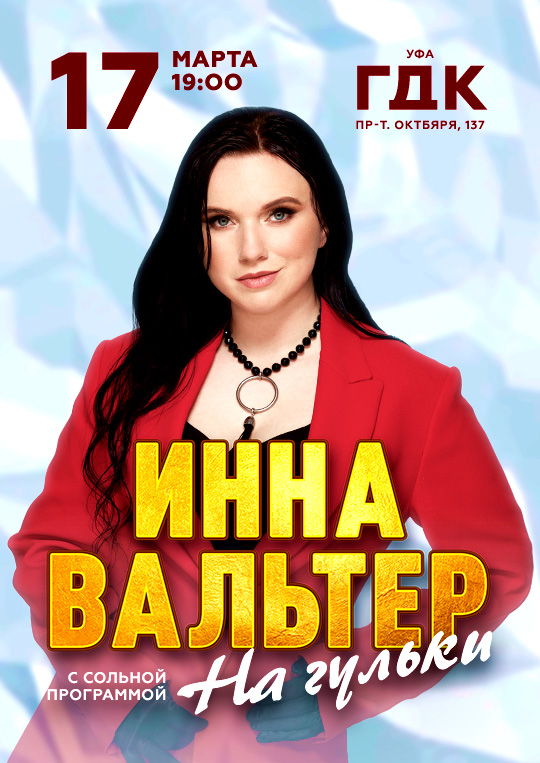 Популярная певица Инна Вальтер представляет свою новую концертную программу «На гульки», в которой прозвучат популярные песни «Корона», «Кабала», «Женская интуиция», "Лети", а также одноименный с программой Хит «На гульки», который набрал более 100 миллионов просмотров в социальных сетях!