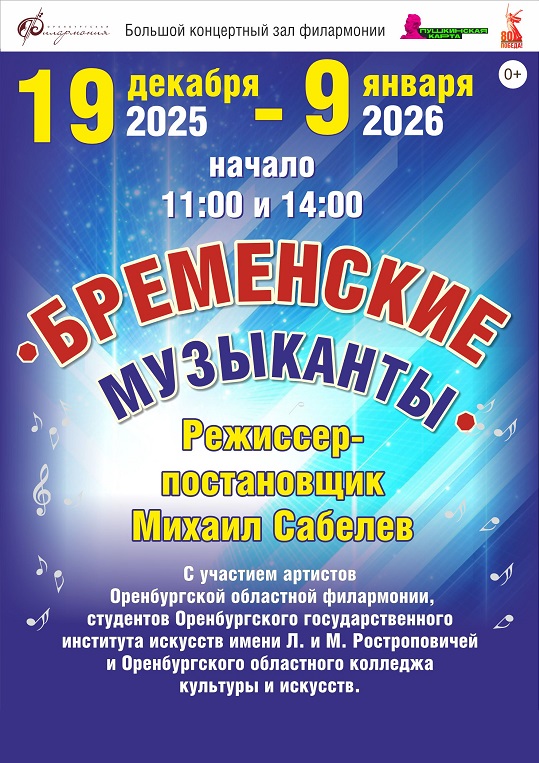 В Оренбургской областной филармонии  19 декабря 2025 года состоится премьера - «Бременские музыканты», которая обещает стать настоящим праздником для всей семьи. Это представление, основанное на знаменитой истории, знакомой многим поколениям, перенесет зрителей в мир волшебства и музыки, где главные герои — забавные и обаятельные персонажи, которые споют всенародно любимые хиты с оригинальной музыкой Геннадия Гладкова.