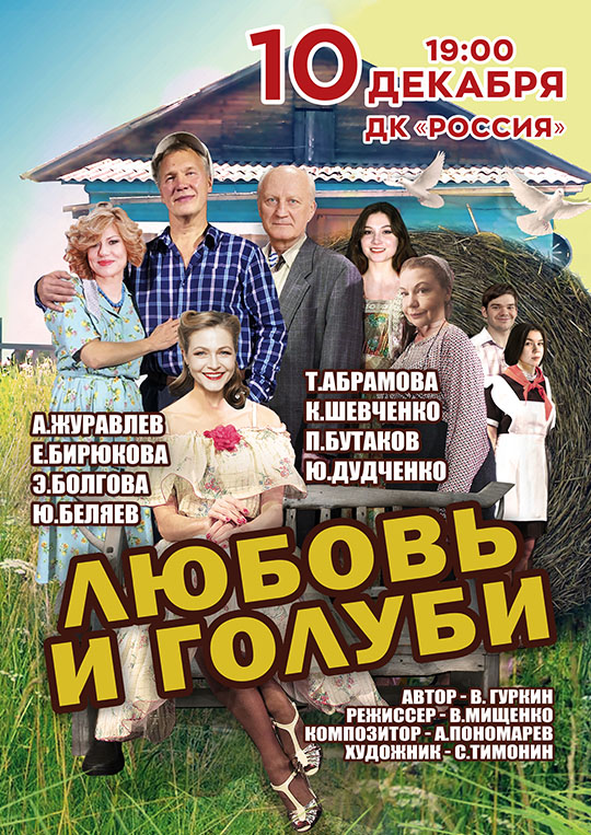 Всенародно любимая комедия и всенародно любимые актеры. В спектакле по пьесе В. Гуркина «Любовь и голуби». Лиричную, трогательную и невероятно смешную историю любви, измены и прощения вы увидите в исполнении трёх поколений «звёзд» российского театра и кино, от легендарных актёров, любимых с детства, до новых, ярких восходящих «звёзд» (сериалы «Молодёжка» и «Вечный отпуск»). Актёры не только сыграют, но и споют, так как история у нас ещё и музыкальная.